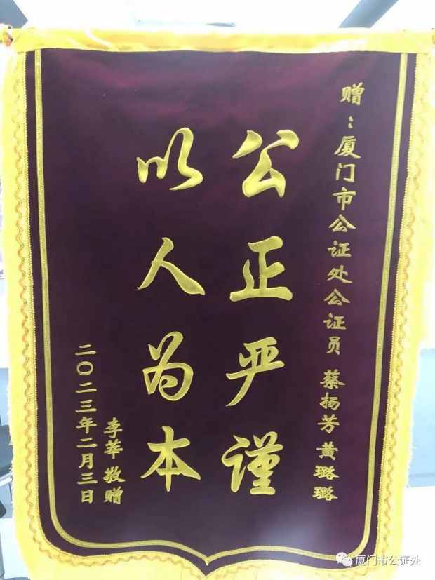 2月3日,当事人李女士来到我处领取公证书时,向我处公证员蔡扬芳和公证员助理黄璐璐送上一面写有“公正严谨,以人为本”的锦旗,对她们在办证过程中的认真细致、热情周到的服务表达了谢意。